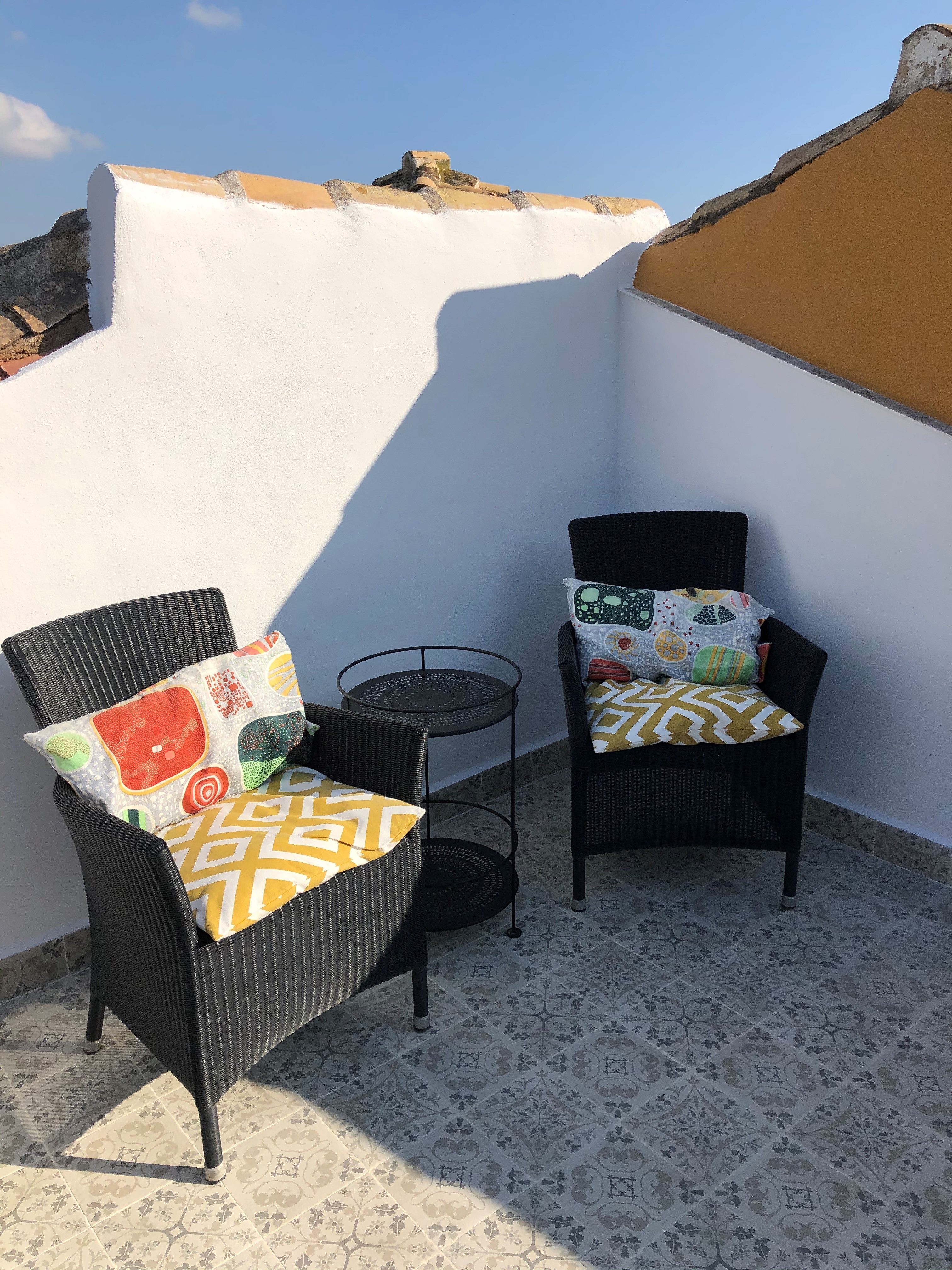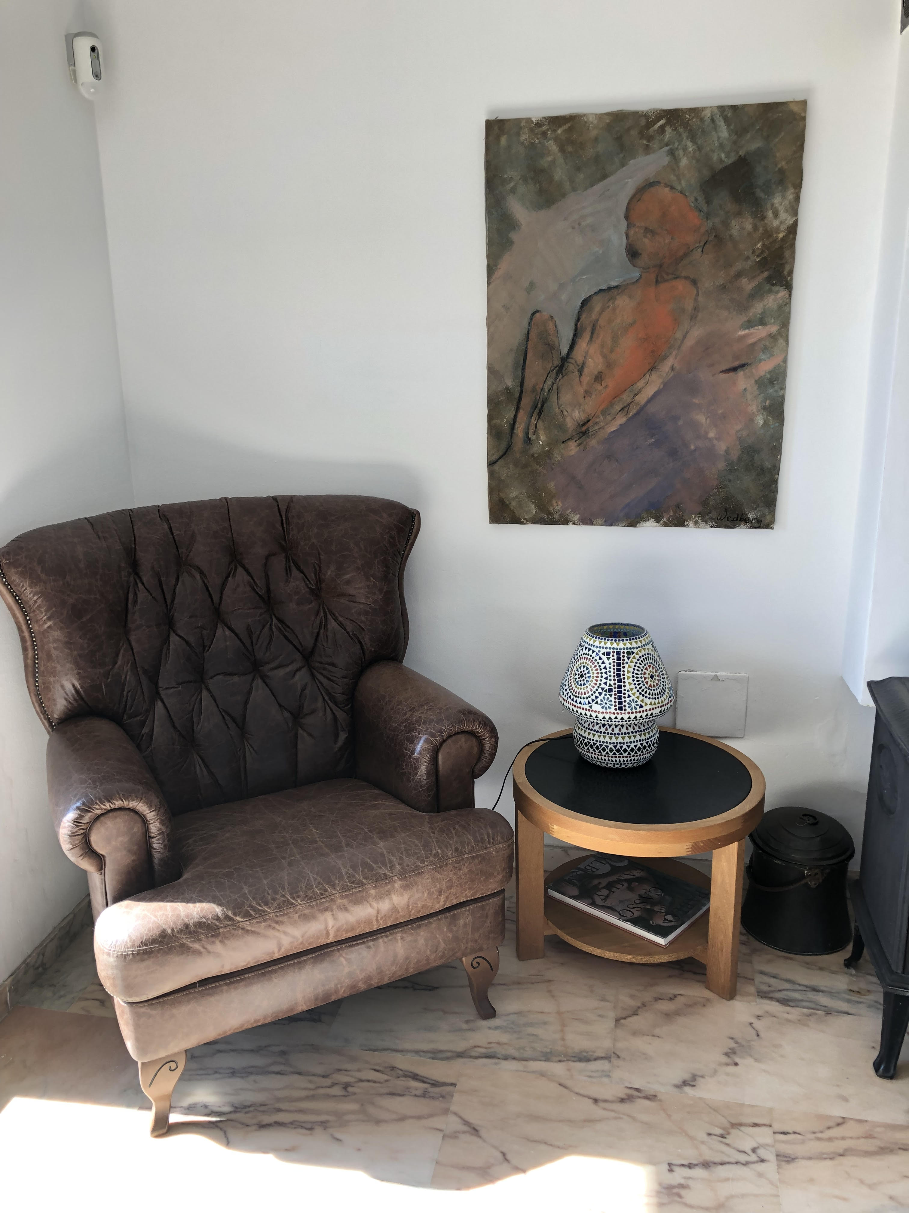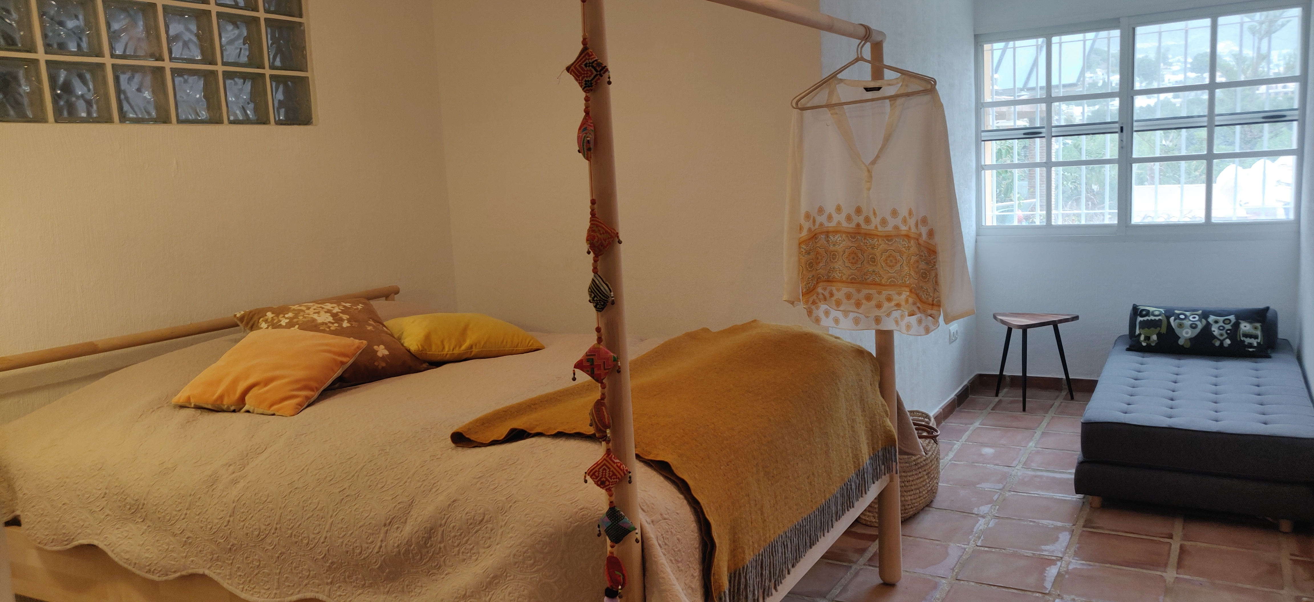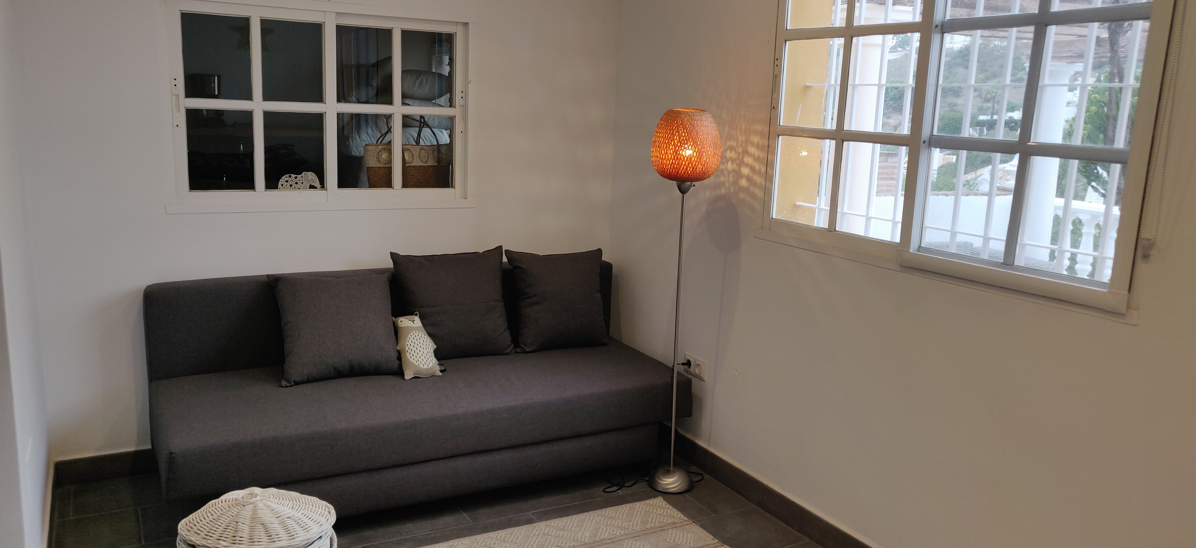 Lägenheten består av ett stort sovrum med dubbelsäng och bäddsoffa, dusch och liten toalett. Det finns ett eget kök med egen ingång/utgång till fin terrass med loungemöbler med utsikt mot bergen.