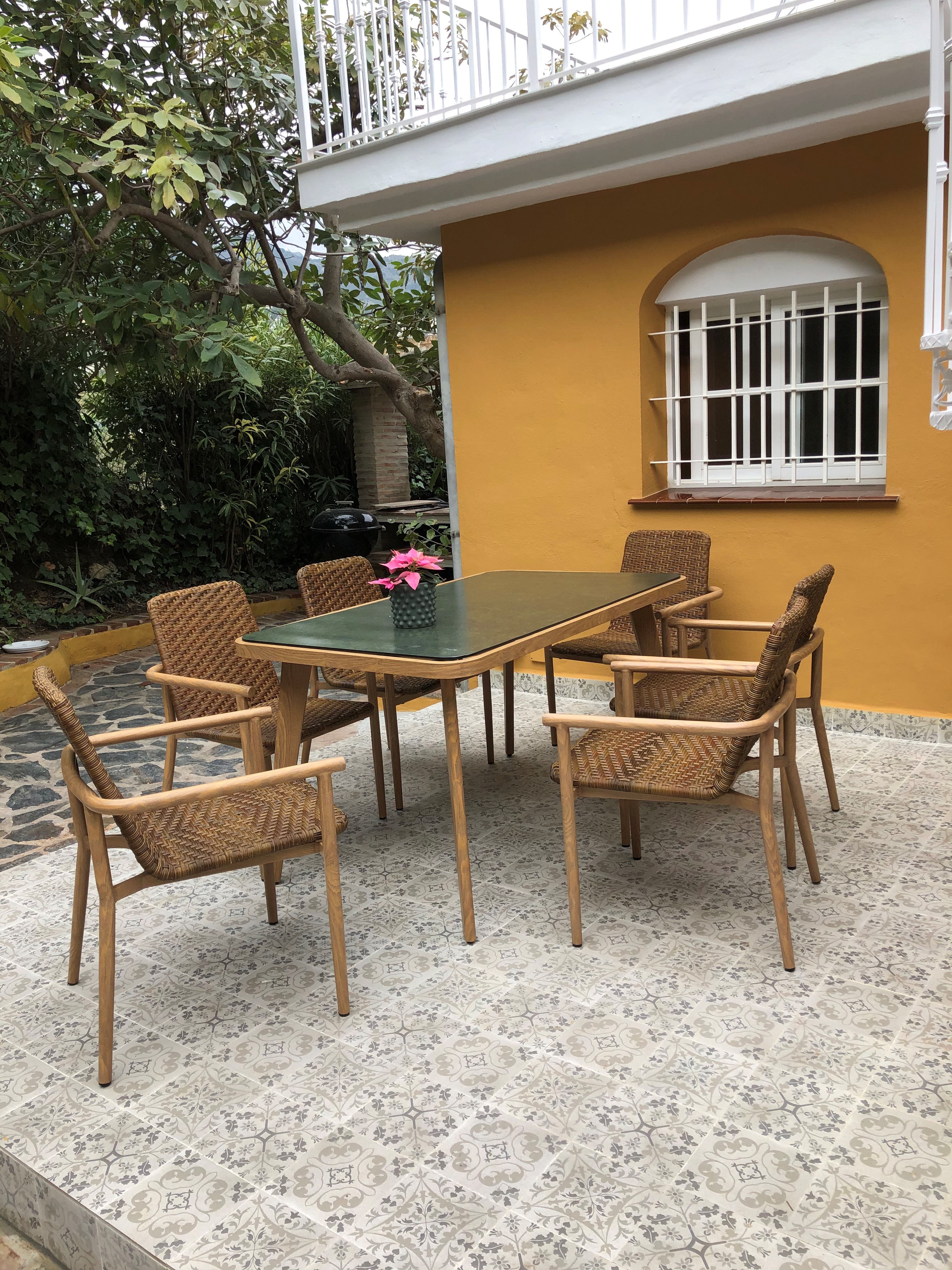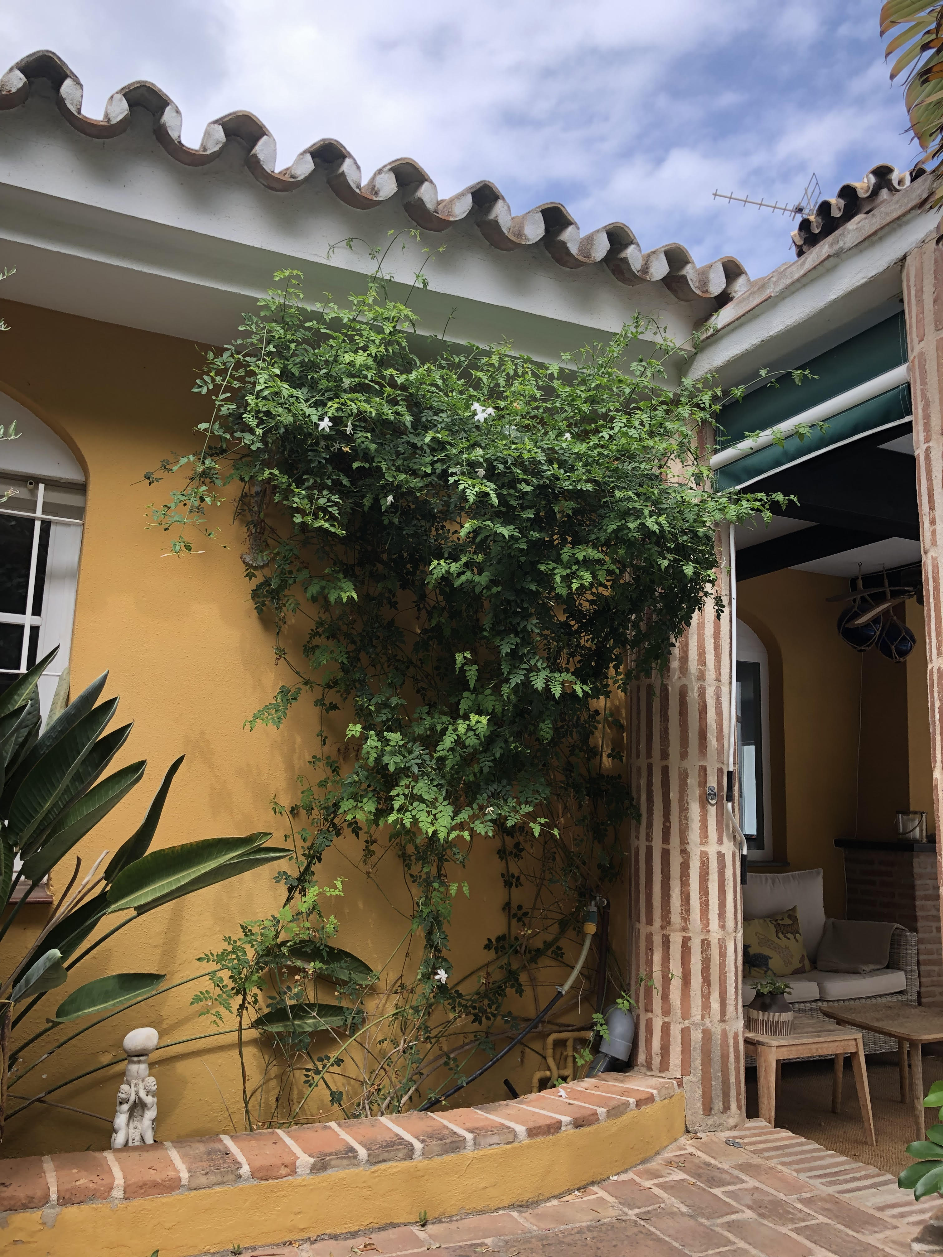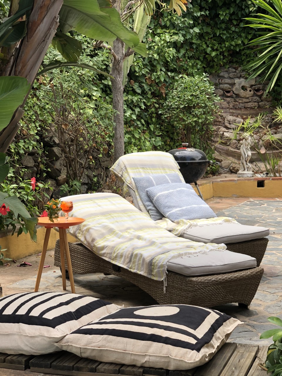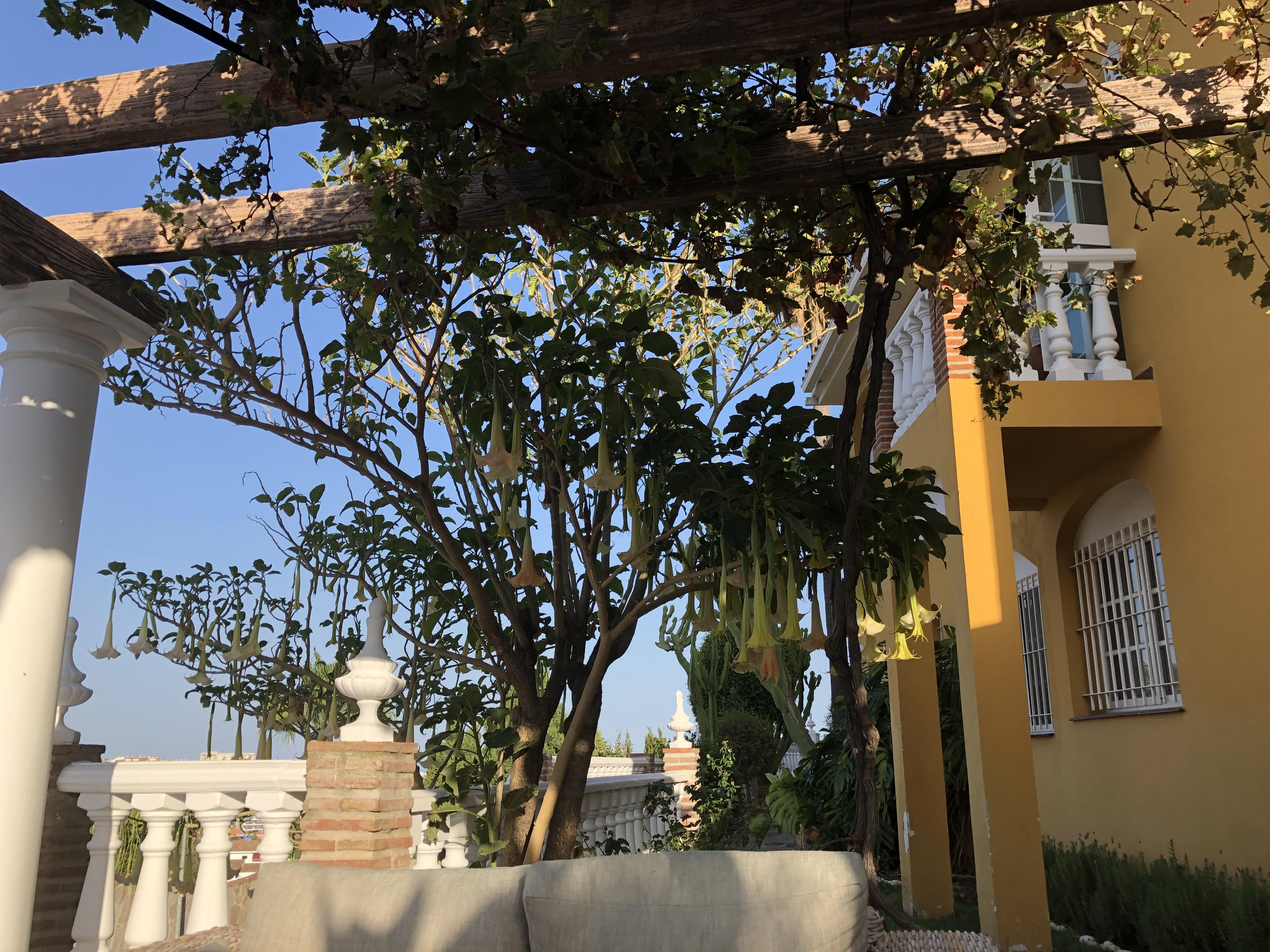 Till huset hör en exotisk trädgård och pool mot berget. Murgröna, avokadoträd och olika växter skapar en djungelkänsla. Det är mycket lugnt och tyst.