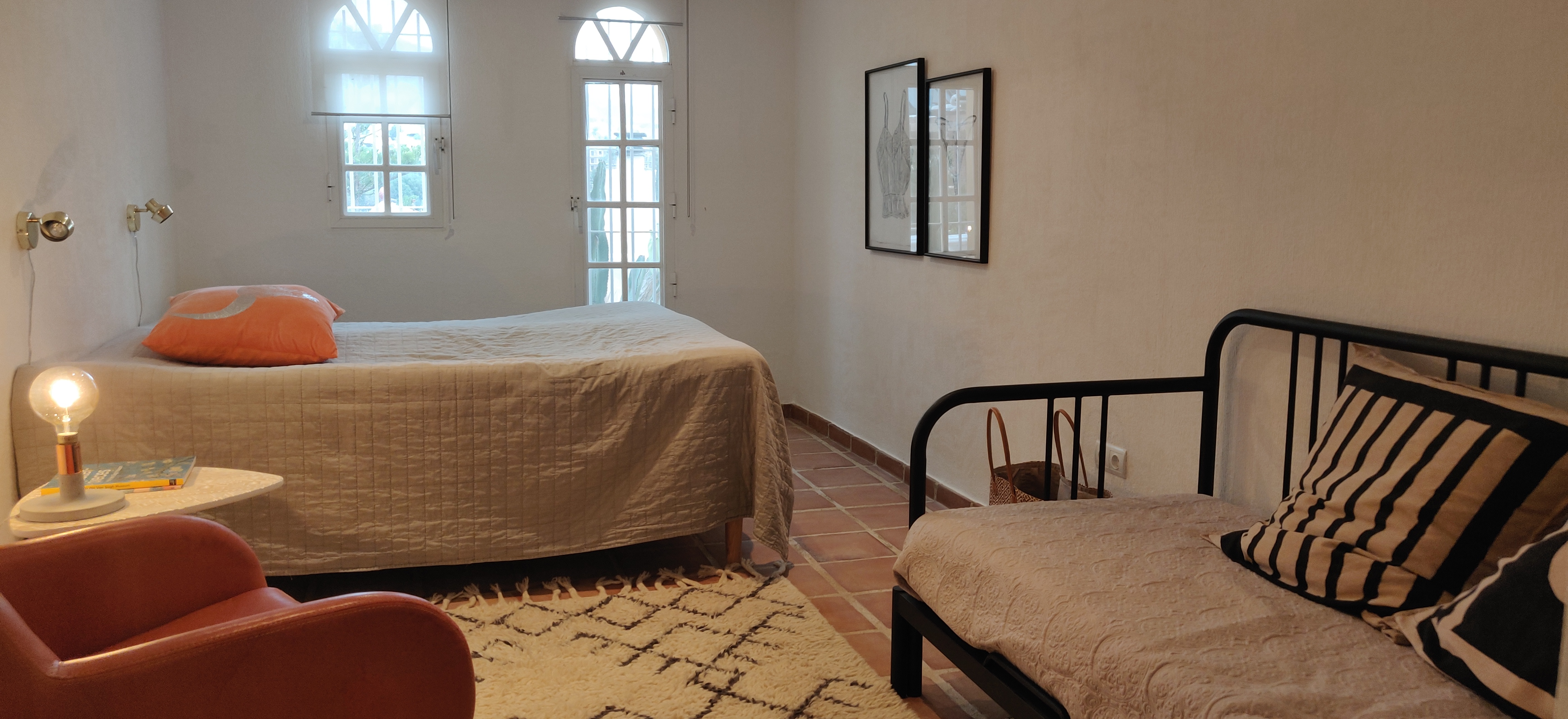Den lilla lägenheten är 40 m2 och ligger i anslutning till övriga sovrum och badrum på nedre våningen. Den kan vara en del av att man hyr hela huset eller hyras ut separat när vi är på plats.