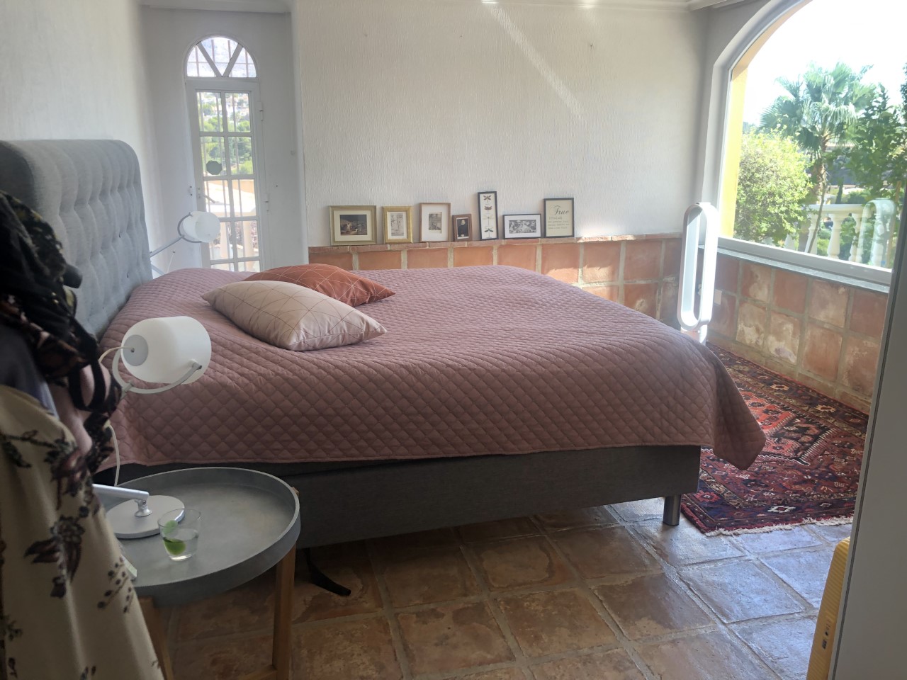 Sovrum 1 – Master bedroom är det största med utsikt över trädgård och hav.